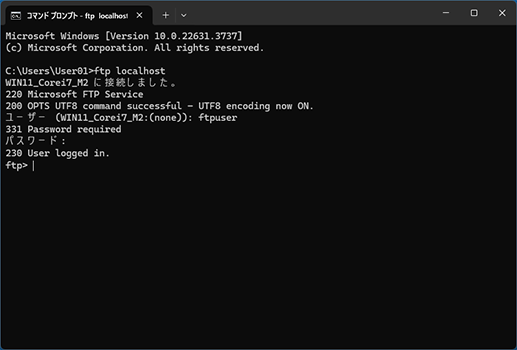 (1)「ftp localhost」と入力して、[Enterキー]を押します。接続できない場合は、「ftp 127.0.0.1」を入力してください。