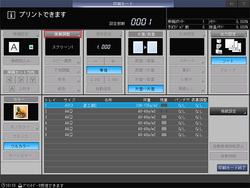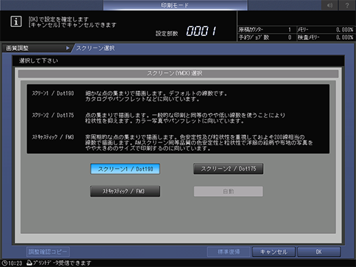 登録枠に空きがない場合 | 以下の条件に該当したものに上書き登録します。 複数該当した場合は、若い番号の条件から優先的に上書きされます。 (1) 同一スクリーン+同一用紙種類+同一坪量で日付の古い調整値 (2) 同一スクリーン+同一用紙種類で日付の古い調整値 (3) 同一スクリーンで日付の古い調整値 (4) 最も日付の古い調整値 ただし、上書きしようとしている調整値が、登録してある中で唯一のスクリーンだった場合は、上書きは行わずに別のスクリーンで日付の古い調整値へ上書き登録されます。 |