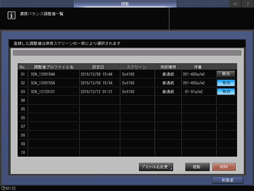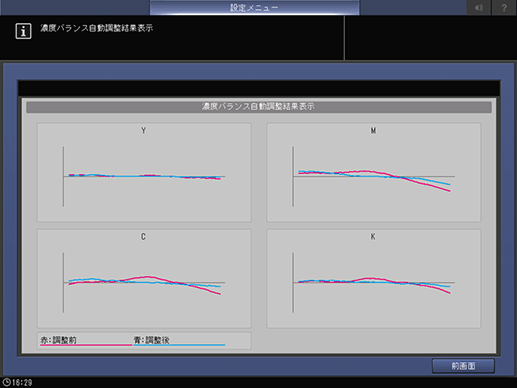 [いいえ]を選択すると、濃度バランス調整値の一覧が表示されます。[前画面]を押して、[濃度バランス自動調整]画面に戻ります。