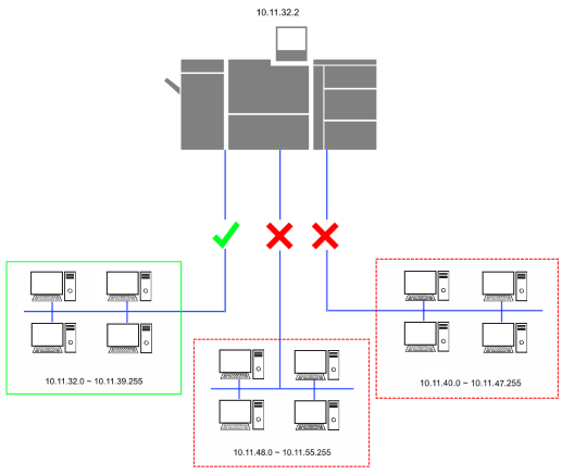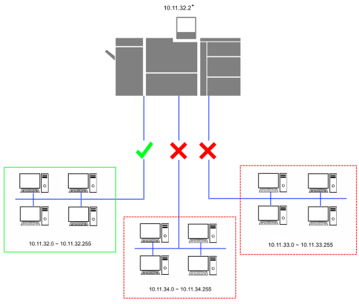 本体またはイメージコントローラーに設定されているIPアドレスと、サブネットマスクを使用し、同じサブネットワークに属するIPアドレスの範囲のみアクセスを許可します。