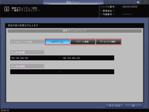 IPアドレスの許可範囲を設定して、その範囲外の機器が拒否されます。簡単ですぐに範囲を確認できるため、便利です。