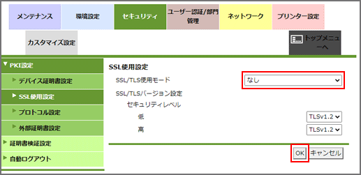 [SSL/TLSバージョン設定]は、[低]を[TLSv1.0]、[高]を[TLSv1.3]に設定することがおすすめです。