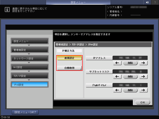IPv4は、「xxx.xxx.xxx.xxx」というIPアドレスを本機に設定したい場合に使用します。