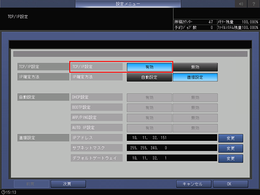 [直接設定]:手動でIPアドレスを(必要であれば、サブネットマスク、デフォルトゲートウェイも)設定します。