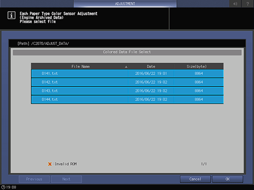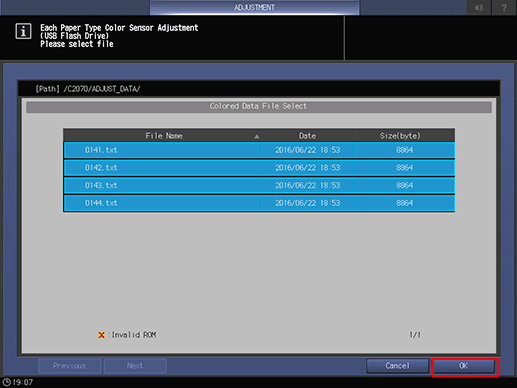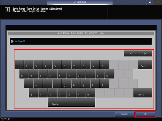 supplementary explanationThe machine is in a busy state to load the colorimetric data with the name entered for the color sensor adjustment data for each paper type in step 5.