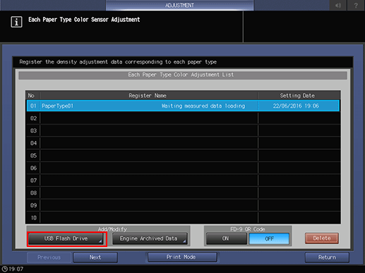 Press the USB Flash Drive on the Each Paper Type Color Adjustment List screen.