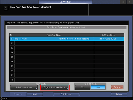 If the color sensor adjustment data for each paper type has already been registered, the register name and date are displayed. If a registered item is selected, the existing data is overwritten.