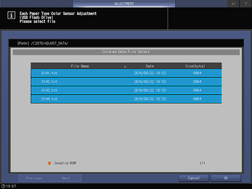 supplementary explanationThe multiple colorimetric data saved in the USB flash drive in step 2 is displayed on the Colored Data File Select screen.