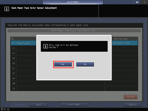 Once you have deleted the color sensor adjustment data for each paper type, you cannot recover it. Please be careful in deletion.