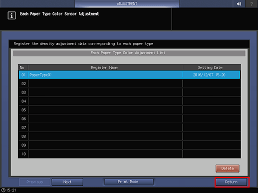 The screen returns to the Each Paper Type Color Adjustment List screen.