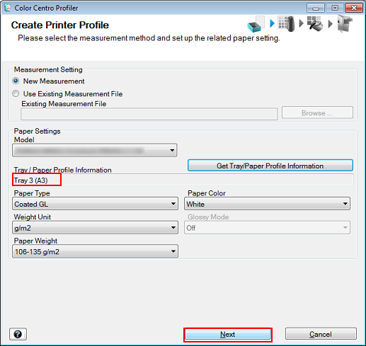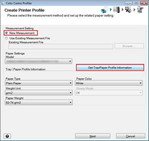 Select New Measurement under Measurement Setting and click Get Tray/Paper Profile Information.