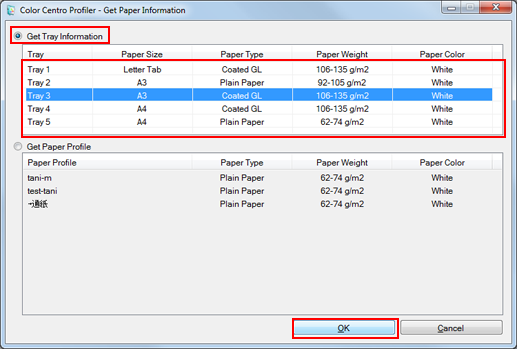Example: Click Get Tray/Paper Profile Information so as to use the paper setting for Tray 3 (Coated GL: (A3) 128 g/m2 / 33 lb Bond).