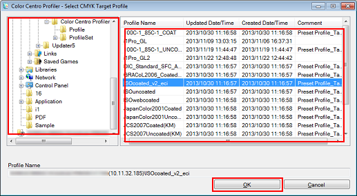 Select a folder from the left side, and then select a CMYK target profile from the list on the right side. Click OK.