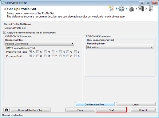 Set the color conversion (rendering) for each object. After setting, click Confirmation Print to check the result.