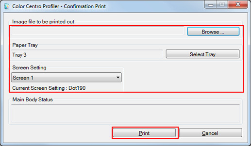 On the Confirmation Print screen, specify the image file to be printed, paper tray, and screen to be used. After setting, click Print.