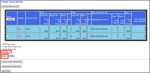 supplementary explanationClick on the check box(es) on the Volume Track data list screen to select the account track data to be deleted. Click on the Delete radio button.