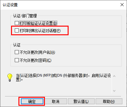 在[认证/部门管理]中,选择[打印时弹出认证对话框]复选框,然后单击[确定]。