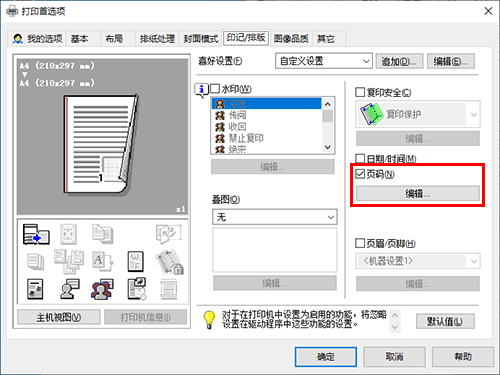 在[印记/排版]选项中,选择[页码]复选框,然后单击[编辑...]。