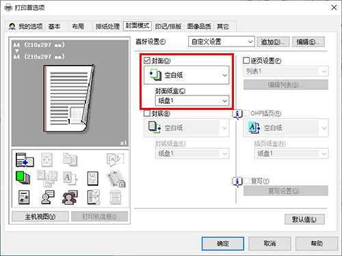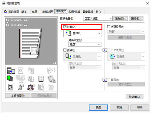 若要使用其它类型的纸张打印封页,在[封面模式]选项上选中[封面]复选框。