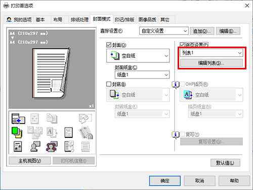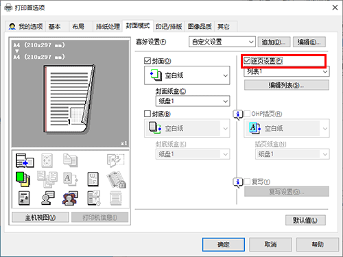 若要使用其它类型的纸张打印章节封页,在[封面模式]选项上选中[逐页设置]复选框。