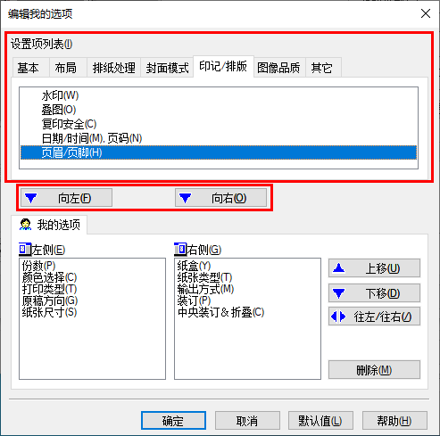 在[印记/排版]选项中,选择[页眉/页脚]复选框,然后选择打印的信息。