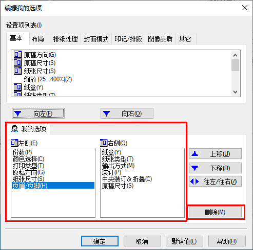 若要删除在我的选项上注册的功能,请选择要在[我的选项]上删除的功能并单击[删除]。