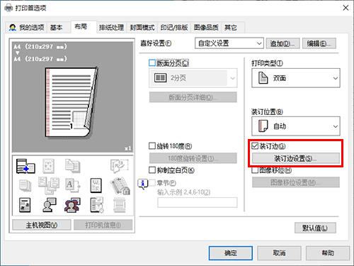 若要配置页边距,选中[布局]选项上的[装订边]复选框并单击[装订边设置]。