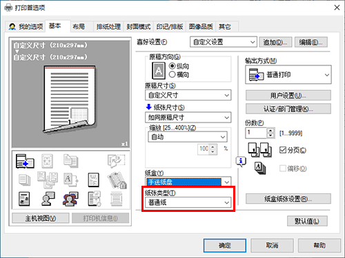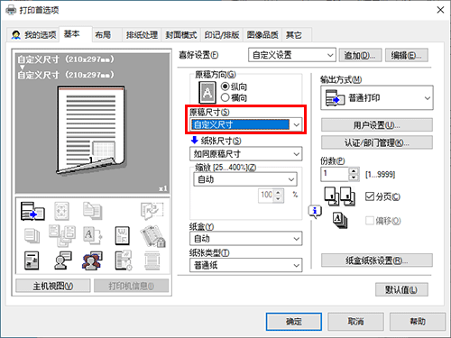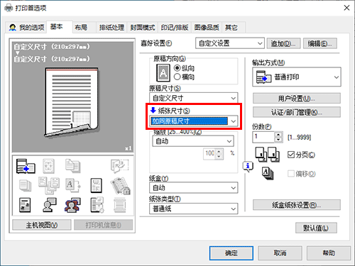 在[基本]选项的[纸张尺寸]中,请选择正确纸张尺寸。