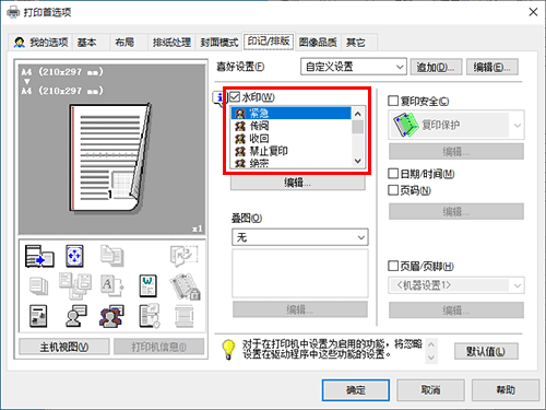 在[印记/排版]选项中,选择[水印]复选框,然后选择水印。