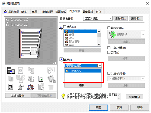 若要在计算机上创建的文件输出上打印文档,请从[印记/排版]选项中的 [叠图]选择[打印主机图像],然后选择用于叠图打印的文件。
