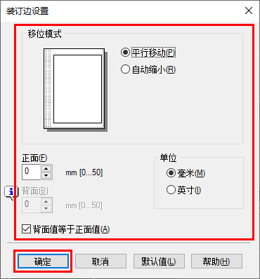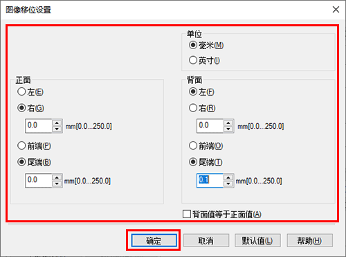 [正面]/[背面] | 设置偏移打印位置的方向和数值。对于双面打印,选择[背面值等于正面值]复选框将允许您为正反面指定相同的值。 |