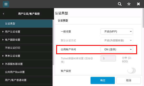 选择[公用帐户访问],再选择[ON (登录)]或[ON (不登录)],然后触摸[确定]。
