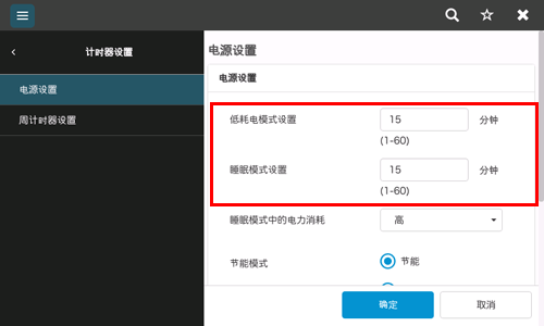 若要设置进入低功耗模式前经过的时长,在[低耗电模式设置]中输入时间,然后触摸[确定]。