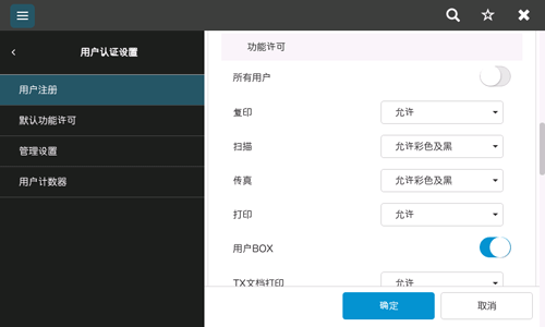 [用户BOX] | 若要允许操作用户Box中的文件,选择开启。若要禁止操作用户Box中的文件,选择关闭。 |