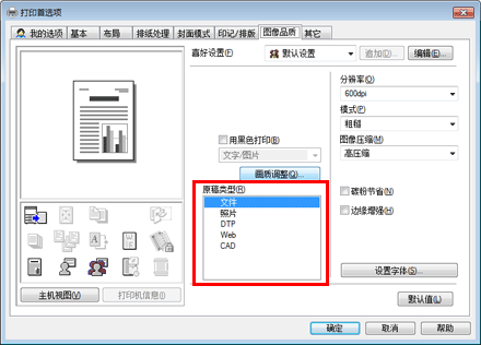 根据要打印的原稿选择下列处理中的一种;适合主要由文字组成的原稿的处理、适合照片的处理、适合使用DTP创建的原稿的处理、适合打印网页的处理或适合打印CAD数据的处理。