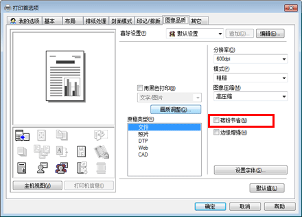在[图像品质]选项中选择[碳粉节省]复选框可以调整打印浓度,以节省消耗的碳粉量。
