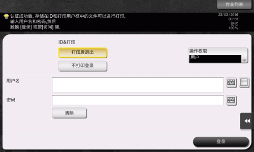 确认已在[ID&打印]中选择[打印后退出],然后触摸[登录]。