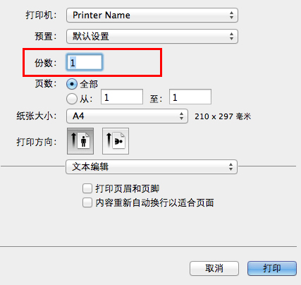 在[份数和页数]的[份数]中,指定要打印的份数。