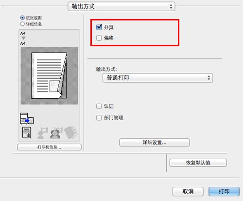 当选择[输出方式]中的[分页]复选框时,副本按套输出,例如"页1、2、3、4和5"、"页1、2、3、4和5",然后还是"页1、2、3、4和5"。当选择了[偏移]复选框时,各套交错输出。