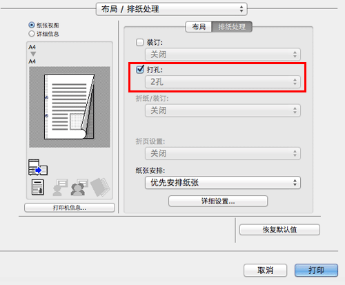 在[布局/排纸处理]中,选择[打孔:]复选框。此外,还可指定打孔的数目和位置。