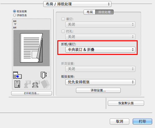 在[布局/排纸处理]的[折纸/装订:]中,选择[中央装订 & 折叠]。