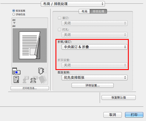 选择[布局/排纸处理]中的[折纸/装订:]的同时使用此功能,可以通过将打印页在中心折叠或在中心用两个订书钉装订,创建小册子格式的文档。