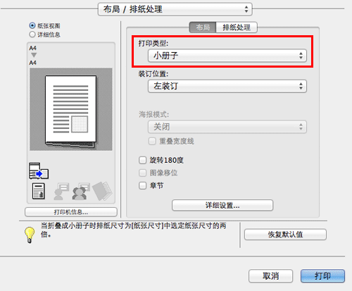 在[布局/排纸处理]的[打印类型:]中,选择[小册子]。