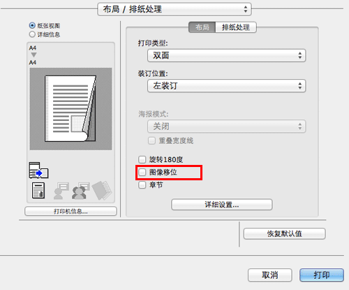 在[布局/排纸处理]中,选择[图像移位]复选框。