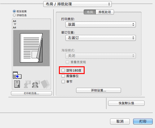 在[布局/排纸处理]中,选择[旋转180度]复选框。
