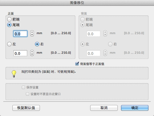 当在双面打印图像时,选择[背面值等于正面值]复选框将给两面同时应用相同的设置。