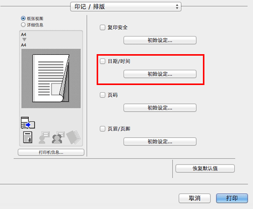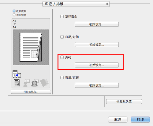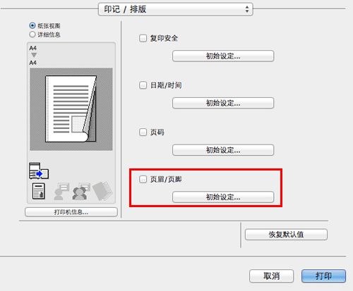 在[印记/排版]中,选择[页眉/页脚]复选框,然后单击[初始设定...]。