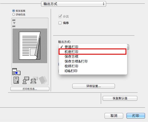在[输出方式]窗口的[输出方式:]中选择[机密打印]。