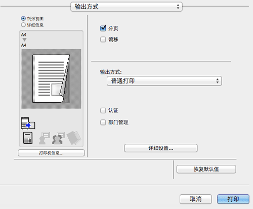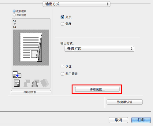在[输出方式]选项上,设置使用密码进行[机密打印]、[保存方框]、[ID&打印]和其他操作的打印功能。