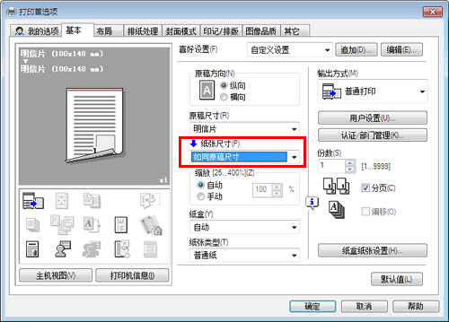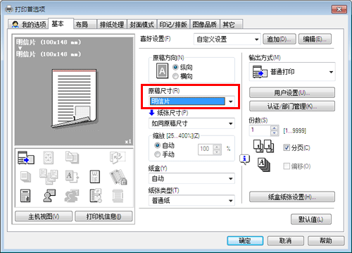 在[基本]选项上的[原稿尺寸]中选择[信封]或[明信片]。